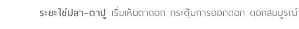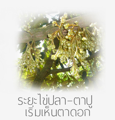 ช่วงระยะไข่ปลา – ตาปู เริ่มเห็นตาดอก กระตุ้นการออกดอก ดอกสมบูรณ์ ทางใบฉีดพ่นด้วย 1. ปิดตา ยืดช่อ (ตรา คนเหล็ก) 250 ซีซี. 2. แอปโซ ผสมเกษร 200 ซีซี. 3. จัมโบ้ แคล (ตรา คนเหล็ก) 200 ซีซี. * (อัตราที่แนะนำผสมน้ำ 200 ลิตร) ทางดินใส่ปุ๋ย สูตร 15-0-0 ผสม ปุ๋ยสูตร 25-7-7 ผสม ดินดี ตราคนเหล็ก